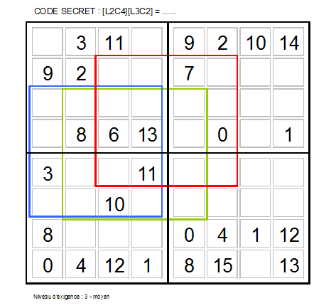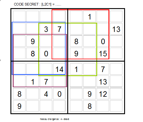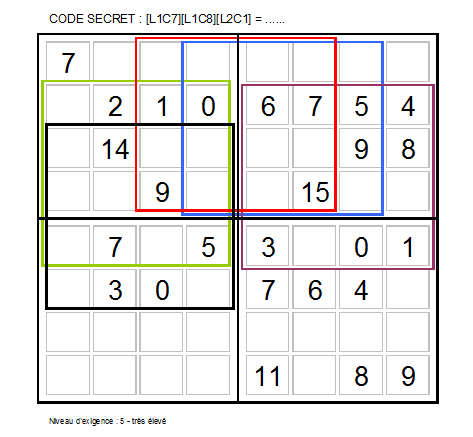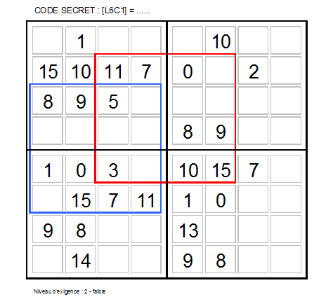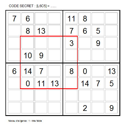 Après avoir rempli la grille, vous allez noter dans un ordre précis et indiqué, certains chiffres appartenant à des cases dont le format est noté [LC] ; L (ligne) et C (Colonne). L’ensemble des chiffres forme le CODE SECRET.